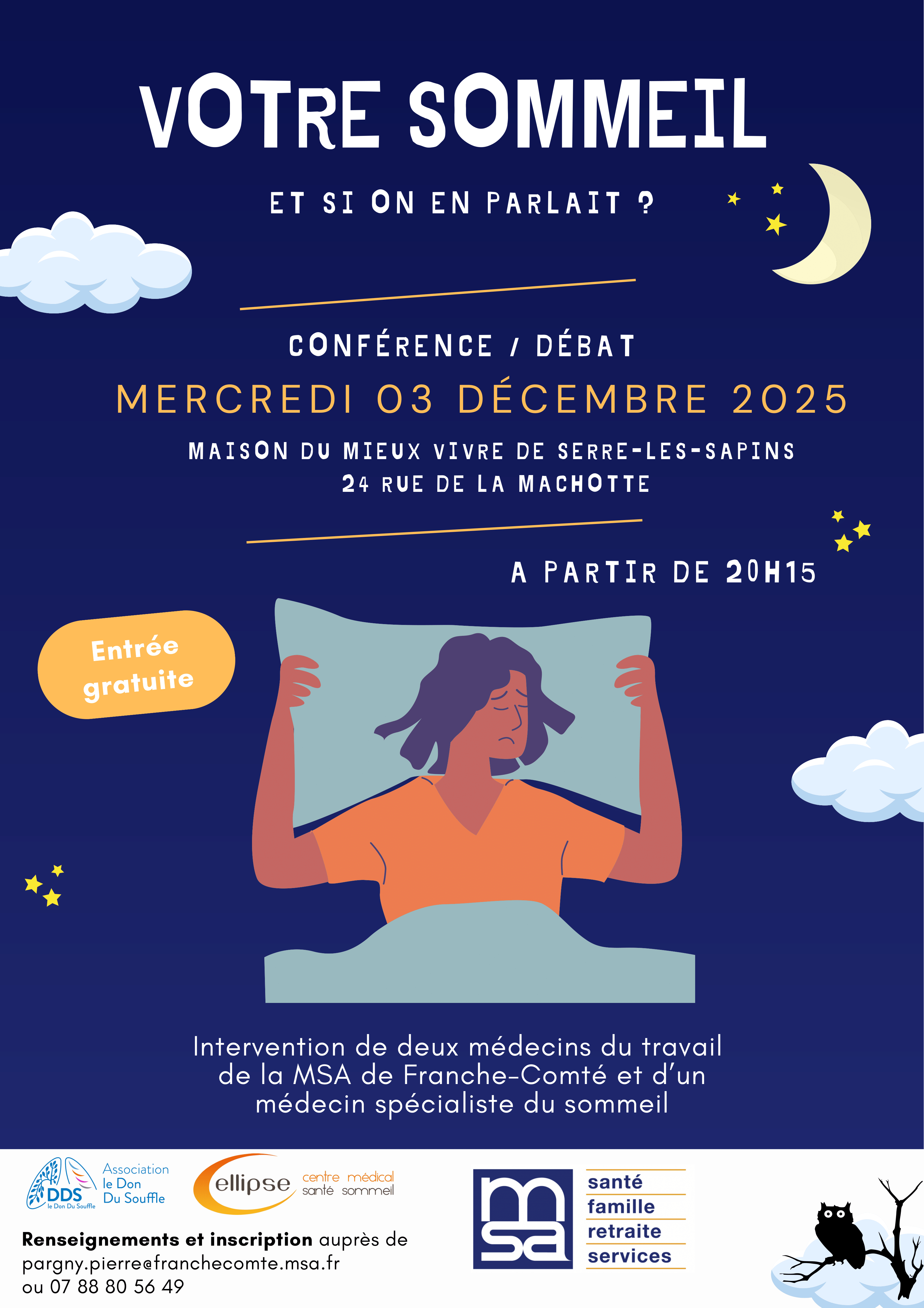 C’est pourquoi la MSA de Franche-Comté organise une conférence gratuite sur le sommeil, ouverte à tous, le mercredi 3 décembre 2025, de 20h15 à 22h15, à la Maison du Mieux Vivre de Serre-les-Sapins (24 rue de la Machotte).